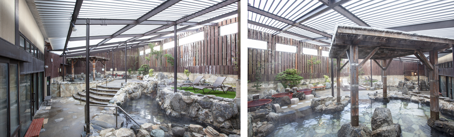지하 800미터에서 생기는 온천이고 매분 400L의 탕수량이 장점입니다. 야외온천은 넓고 여유가 느껴지는 공간으로 편안하게 앉아서 즐길 수 있습니다.