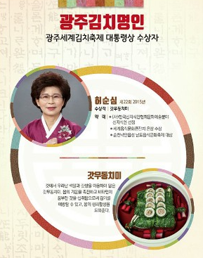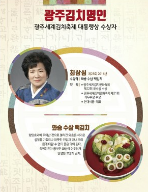 광주세계김치축제 대통령상을 받은 김치명인 정보입니다. 이런 것이 있는 줄 몰랐는데 신기합니다. 최상심 김치명인은 제 23회 광주김치축제에서 수상했습니다. 식이섬유가 풍부한 와송이 어우러진 보양식 김치라고 하네요. 김효숙 명인은 무등산 푸랭이(수박)해물반지라는 이름의 김치를 내놓았네요. 이러한 소식을 알고 가는 것도 또 하나의 재미입니다.