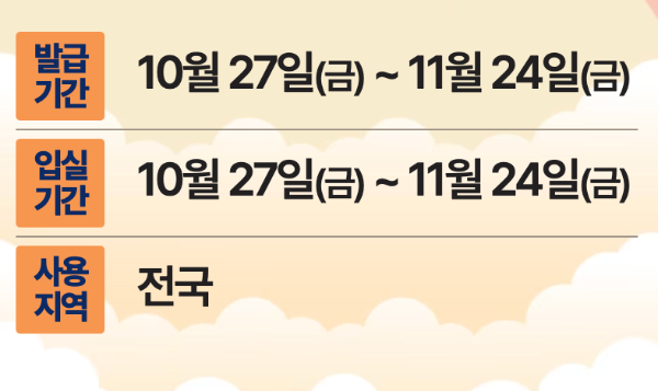 | 발급 기간 | 10월 27일 (금) ~ 11월 24일 (금) |