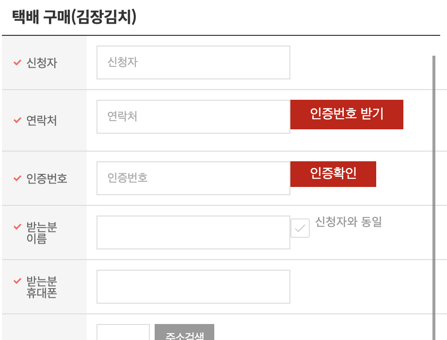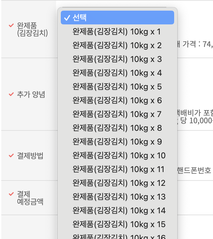 신청자, 연락처, 받는 분 선택하시고, 김장김치는 10kg 기준으로 1개부터 30개까지 살 수 있습니다. 광주 김장대전 김장김치 택배 가격은 1개 69,000원이고 도서산간은 1개 74,000원입니다. 추가양념 택배가격은 3kg당 50,000원입니다.