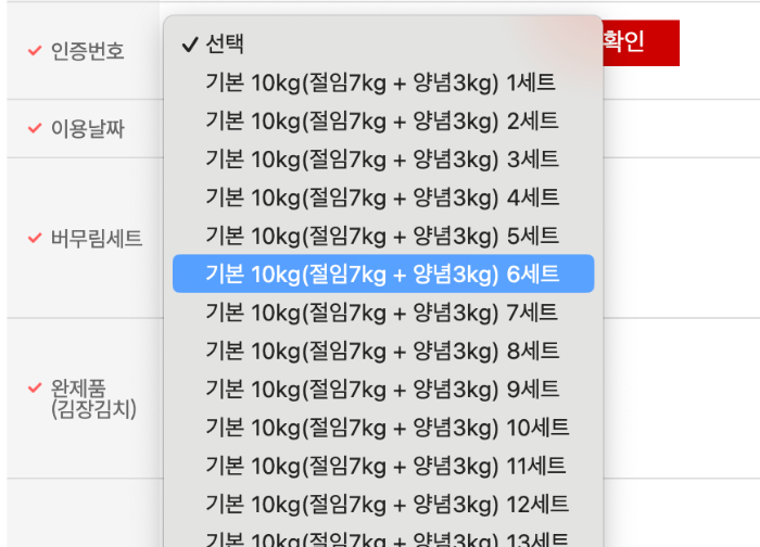 버무림 세트, 김장김치(완제품), 추가양념 각각 선택하시면 됩니다. 주의하실 점은 김장대전에서 절임배추는 별도로 팔지 않습니다. 양념은 변질우려가 있기 때문에 택배로 안되고, 현장수령만 가능하니 신청하실 때 꼭 추가해 주세요.
