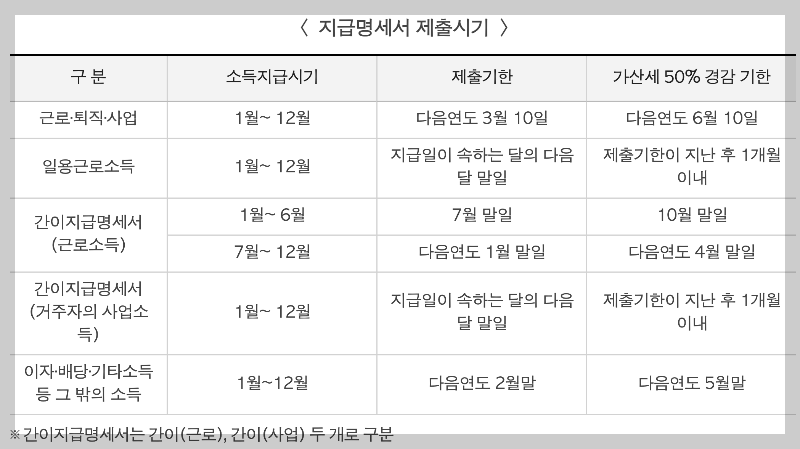 한 해의 1~6월까지의 지급분은 7월 말일까지, 7~12월분은 다음 해 1월 말일까지 꼭 제출해야 합니다. 주의할 점이 있는데요. 하반기 신고를 할때 즉 1월에 신고할때 주의할 점이 있습니다. 직원들한테 12월에 줘야하는 급여를 1월에 줬다면 12월 지급분에 이 사항을 포함시켜서 신고서를 써서 작성해야합니다.