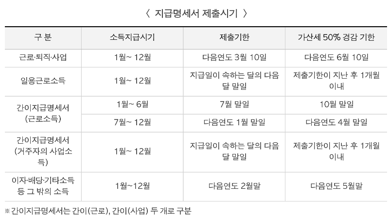 제출기한 놓치면 지급금액의 0.25% 가산세가 붙습니다. 대한민국의 사장님이라면 1월과 7월에 근로소득 간이지급명세서를 필수로 신고해야합니다. 제출기한에 맞춰서 꼭 작성하셔야 겠죠? 꼭 정보 알아두시고 가세요.