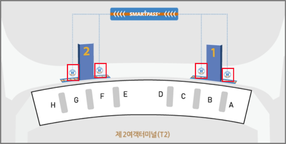 T2 제2여객터미널에서 출국 시 스마트패스 사용가능한 게이트는 위와 같습니다.