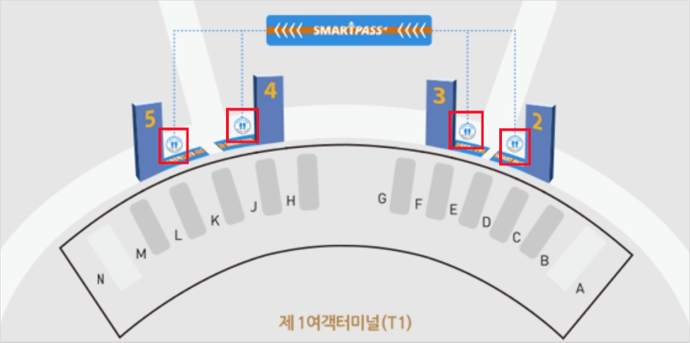 T1 (제1여객터미널)에서 출국 시 스마트패스 사용가능한 게이트는 위와 같습니다.